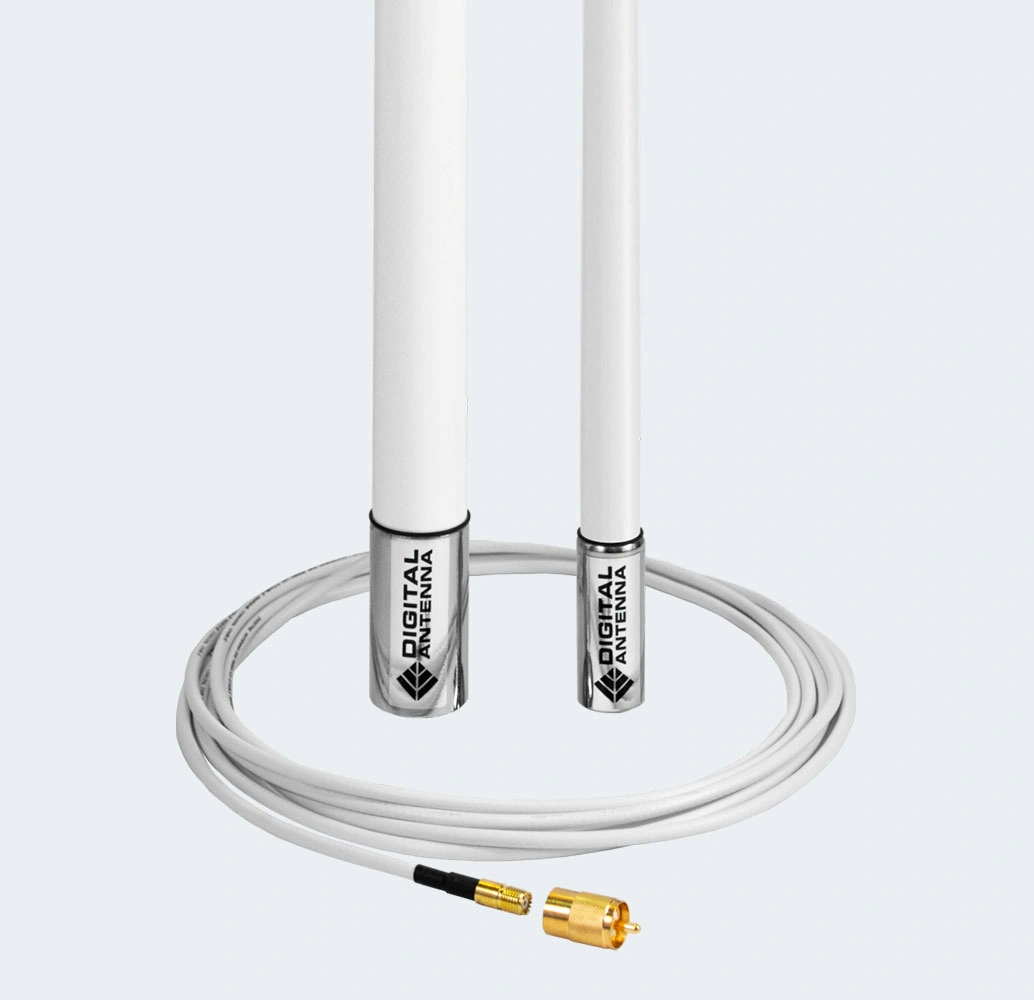 Engineered for larger vessels, Digital Antenna’s 16’ Wideband AIS/VHF antenna delivers powerful, precision-tuned performance across 134–176 MHz for government, commercial, and recreational use. Built with 316 stainless steel, high-gloss UV-resistant fiberglass, and precision brass radiators, it delivers superior analog and digital signal range. A pre-attached mini-connector and PL-259 adapter ensure fast, hassle-free installation. A side support is required 3’–4′ from the base. Ships via UPS, USPS, and FedEx.