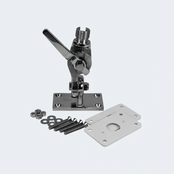 Durable, Heavy Duty 316 stainless steel ratchet mount with lay-down handle allows fast, easy antenna adjustment. Features 1″-14 male threads and a flat 3½” x 2½” base for secure deck mounting.